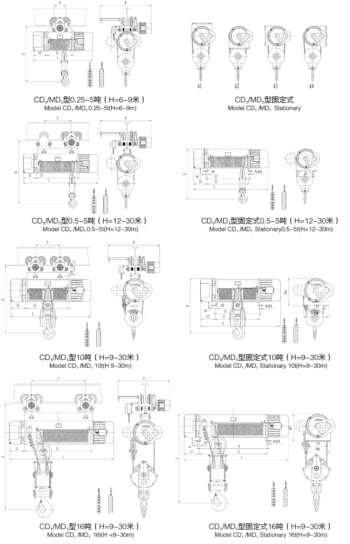 CD1型,MD1型钢丝绳电动葫芦是一种轻小型起重设备。它可以安装在葫芦单梁,桥式起重机,门式起重机,悬臂起重机上。稍加改动,还可作卷扬用。因此,它是工厂、矿山、港口、仓库、货场、商店等常用的起重设备之一,是提高劳动效率,改善劳动条件的必备机械。